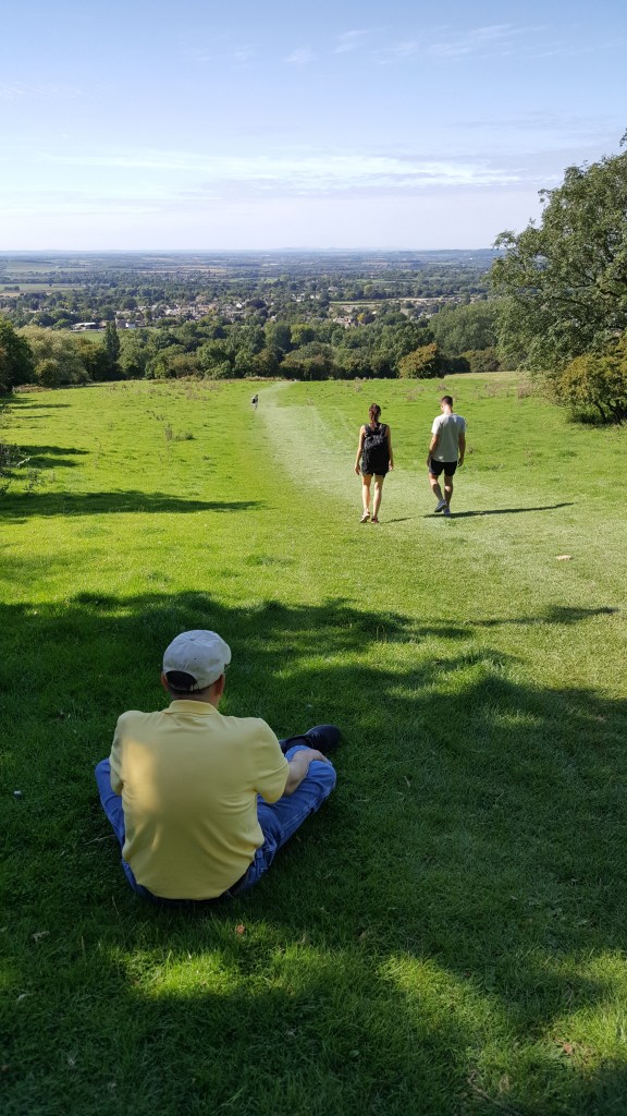 so we found shade beneath some (I think) beech trees, and unpacked the feast. We sat on the grass, looking down into the green valley where Broadway lay, and all the fields and rolling hills around and beyond us. You felt you could just dance over the low-lying hills and fields like a dandelion head blown in the wind.