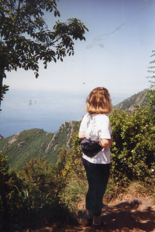 We reach Manarola, and Mario pulls us into a tiny villa where an old Italian woman is making homemade wine. She pours out a glassful, and we pass it around, each taking a sip. Mario buys a bottle to take with us on a picnic. Walking on to Corniglia, we have a delicious lunch, then it’s back to the hotel for a rest.