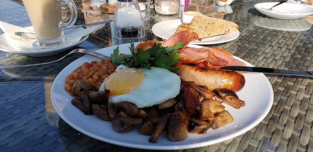 As my stomach was banging against my backbone, Steve suggested we stop at a farm-to-market shop and café situated on rolling English farmland. Called Vegetable Matters, the produce displayed was incredible, and not only beautiful but delish. I had a full English breakfast, and Steve a bacon bap. Yum-o – and filling (I could only eat half!)