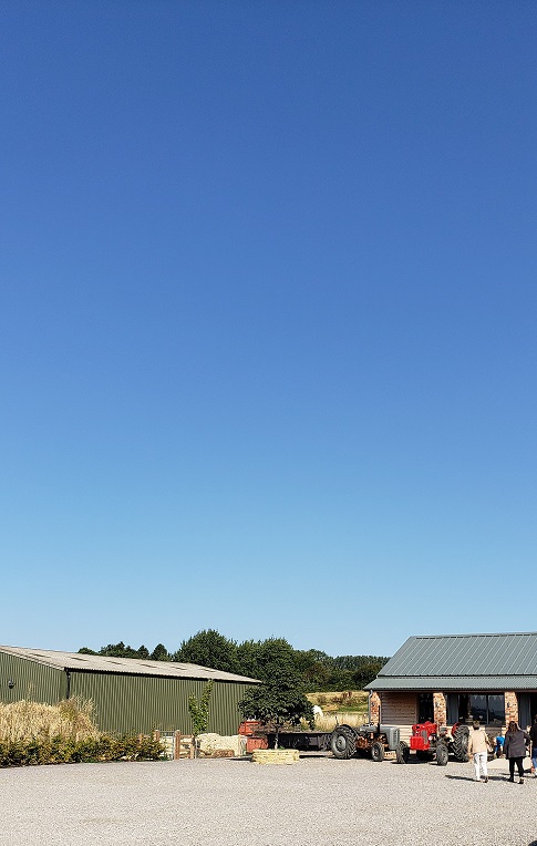 We sat in the sun under a sky so vividly blue it reminded me of driving on the highway to Taos in New Mexico, where the sky looks like it’s painted blue every day. Fields of bright yellow sunflowers spread out around us. A red tractor sat by the low building that housed the fruits and veggies, fresh breads and butters. I stocked up!