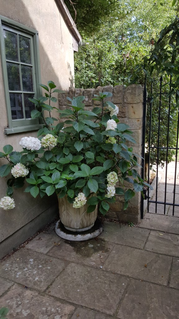 A small wrought iron gate led into a flagstoned enclosure, filled with giant pots of hydrangeas, to the back door. David, as Keeper of the Keys, opened the door, and we walked into the kitchen, which then led to the living room and staircase, and beyond that, the library, which looked out through square-paned windows to the back garden; and then to neighboring meadows where sheep were grazing.