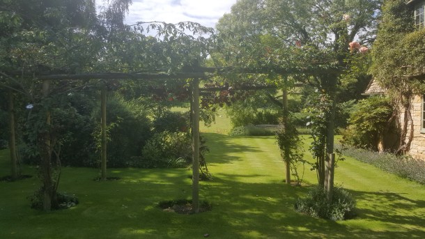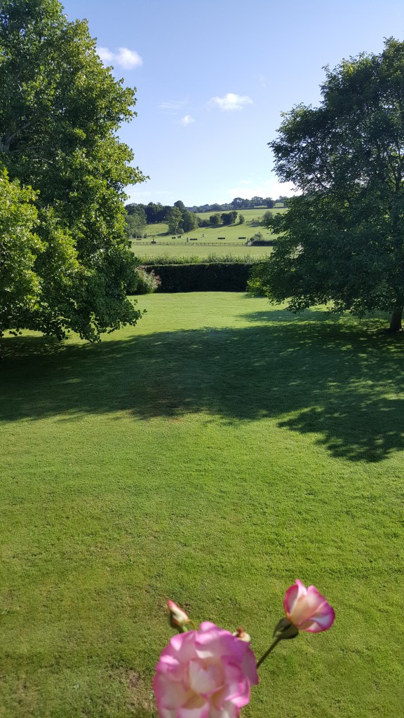 The three upstairs bedrooms (and two bathrooms) all looked out to the Cotswolds countryside. Mine happened to be papered with roses, and had two casement windows, one with pink and gold climbing roses framing far green fields; the other looking down over the sweep of the gravelled drive and broad expanse of lawn dotted with trees.