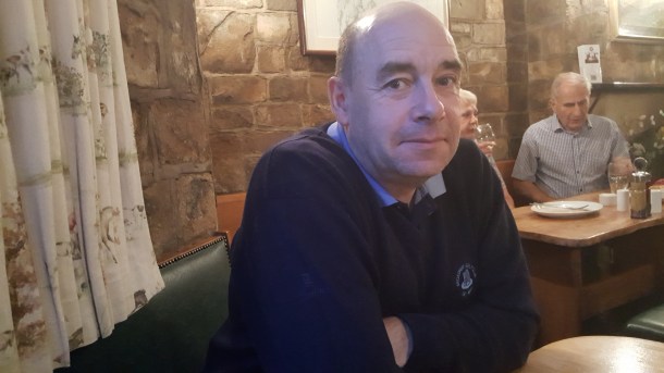 At the end of it all, Steve, our driver, was waiting patiently…and even more patiently when I had to unzip my luggage on the platform and dive beneath everything to find the folder with all the passcode information for getting into Old Orchard! (This is Steve, later in the trip, sharing a drink…)
