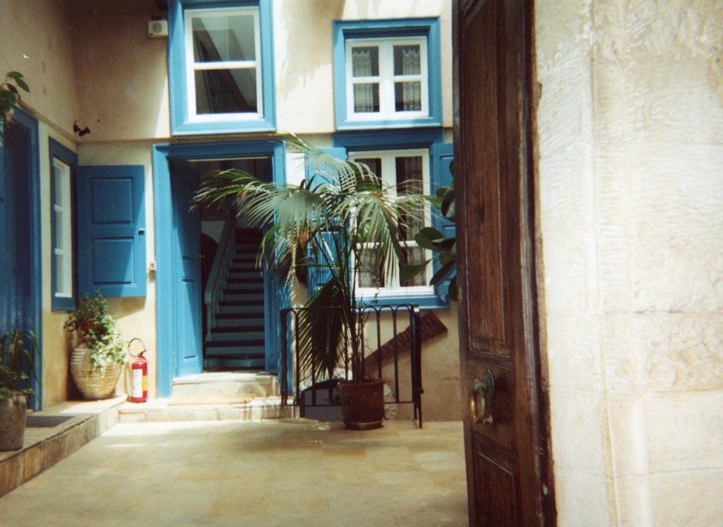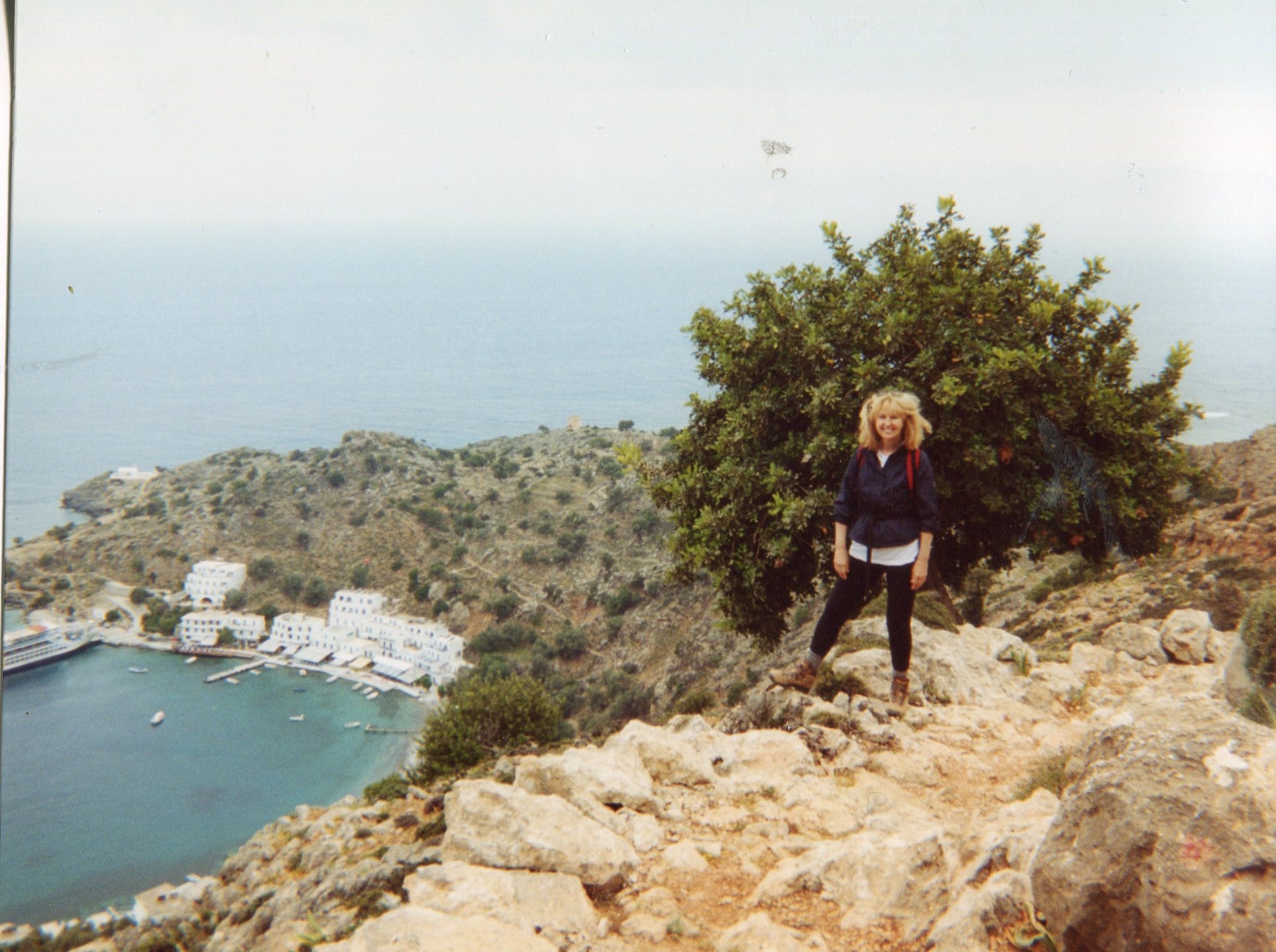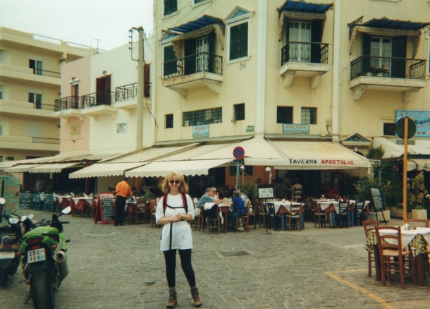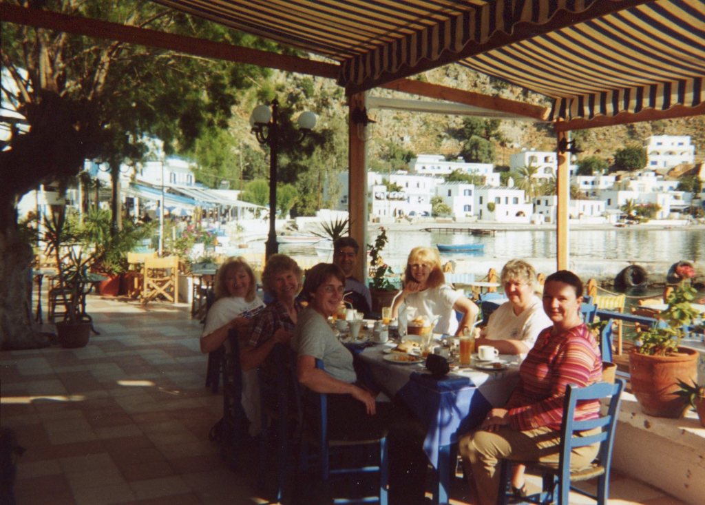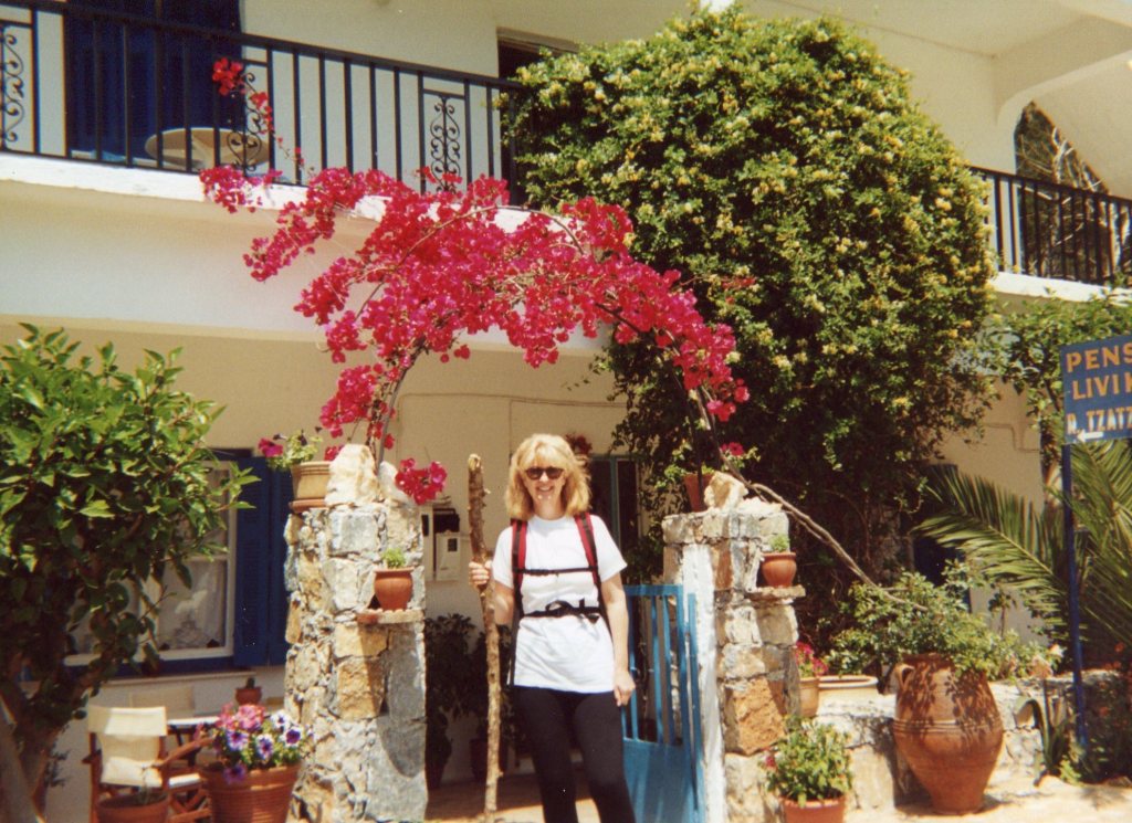 Our first glimpse of Loutro is of a heavenly small port on the Libyan sea coast, its buildings whitewashed and edged with the vivid blue shutters of Greece – all facing the water. Our hotel, the Sitis, is at the far edge of the tiny waterfront. It is hard to describe my feelings on first seeing Loutro: it is all I had hoped Greece and Crete would be.