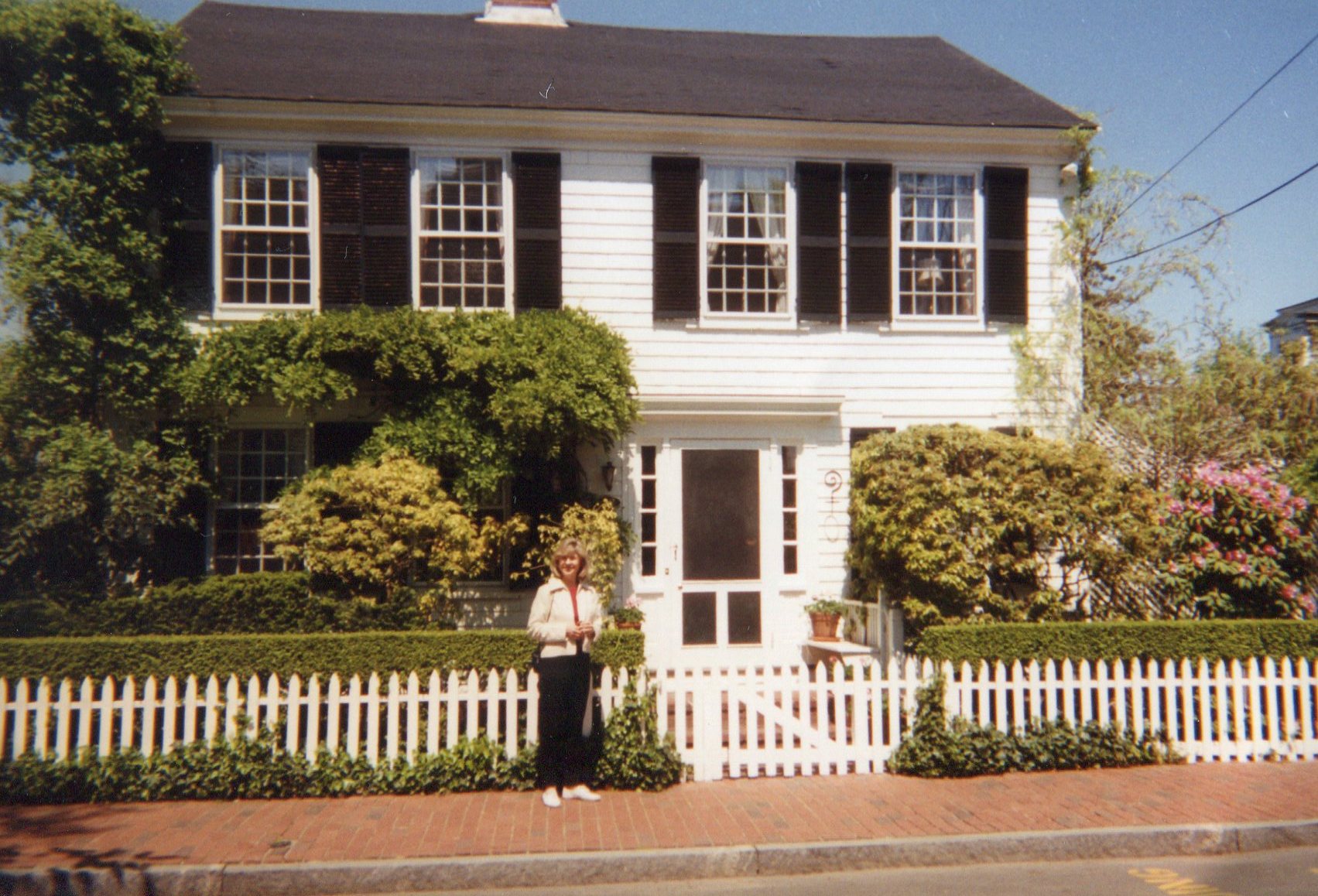 After breakfast, we rambled down to Edgartown. How beautiful – and how clean – it all was, like something from a wonderful picture book. The houses were pristine, painted white-white or Nantucket gray, and flowers bloomed everywhere we turned. The biggest rhododendrons in scarlets, pinks and white. Lilies of the valley, hedging a white picket fence. Hawthorn, lilacs and wisteria blooming madly. Gigantic tulips, daisies, buttercups and forsythia everywhere, with geraniums splashing in pinks and vibrant reds.