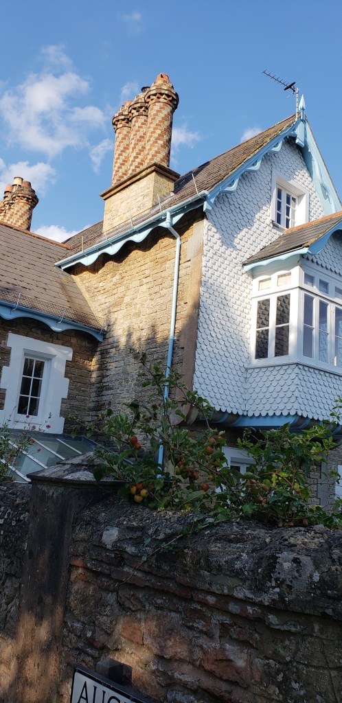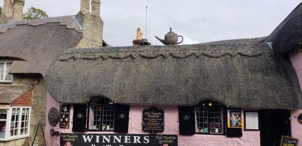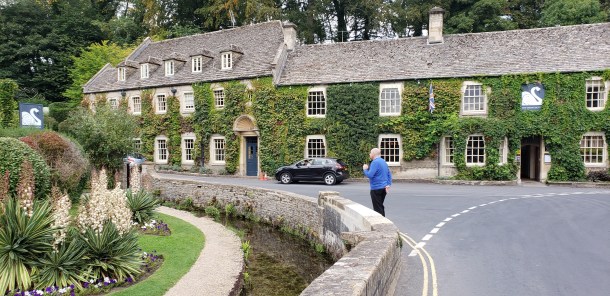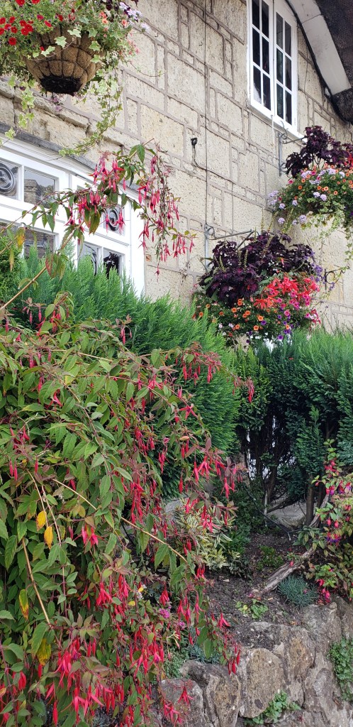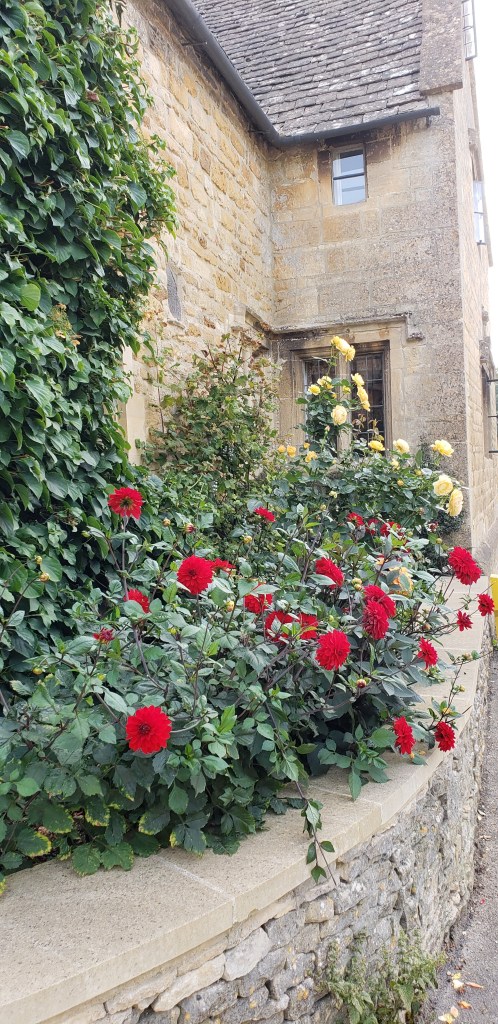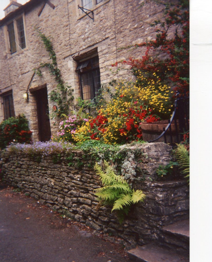 The bathroom had a marvelous deep tub – great for warming up. After a good soak, I climbed into bed and fell fast asleep. At 4PM, awake and ready to eat, we drove into Broadway. The overcast skies had cleared, and the sun appeared. We rambled down the street, peering into every shop window – all of which could have been lifted en toto from Dickens – all the golden Cotswolds stone – all hung with ivy and other vines, and surrounded by blooming flowers, from lavendar to double headed pink and purple petunias to bright red geraniums. Broadway is a charming town, full of atmosphere. The people are delightful- and it was not busy (at that time of year, anyway.)