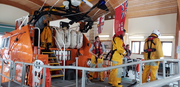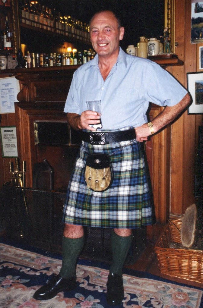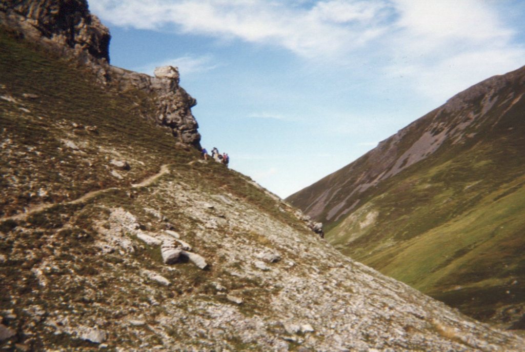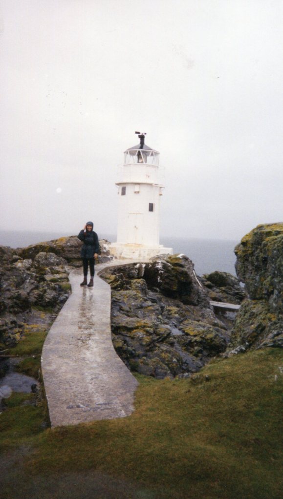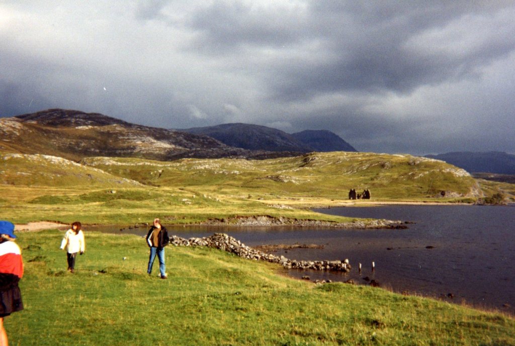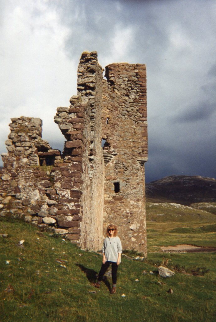 A short detour to a castle ruin high on a hill, and we were scrambling over tussocky grass and pebbly streams and up a short rise to a very, very narrow ledge – where we each clung to the stones and edged slowly across – or fell to boulders below! Once atop this hill, Brian read us some tales of Scotland, and had us act them out. For some reason, we also lined up in a row, each of us sitting on the knees of the person behind us, pretending to be rowing a Viking ship – don’t ask me why!