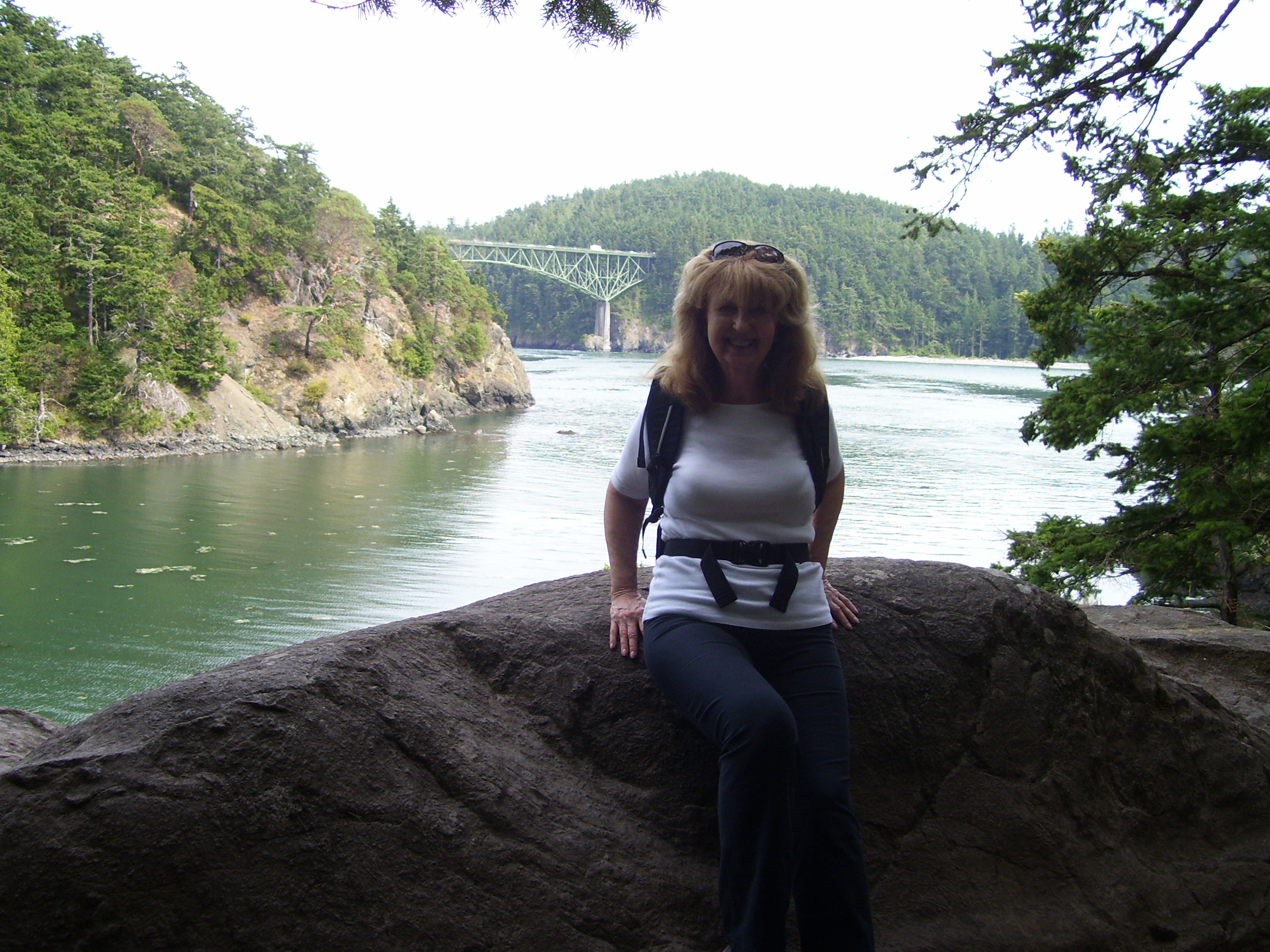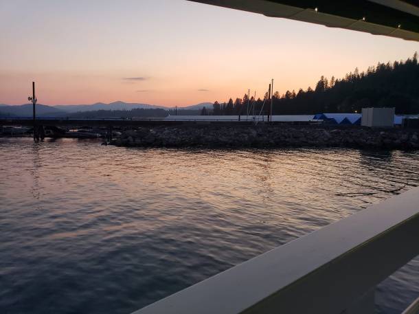Coeur d’Alene is a lovely name for a beautiful town. We hiked one of its trails, not terrifically difficult but nonetheless uphill and rocky…it circled Lake Coeur d’Alene with misty views of far-off mountains, fir and pine forests, and beautiful blue clear water. The trail itself for the most part was paved in pine needles, so soft underfoot. The sun shone through the pines, and the scented air smelled of pine resin. We had dinner at a floating restaurant bathed in the sunset…the beauty of the view was enchanting.