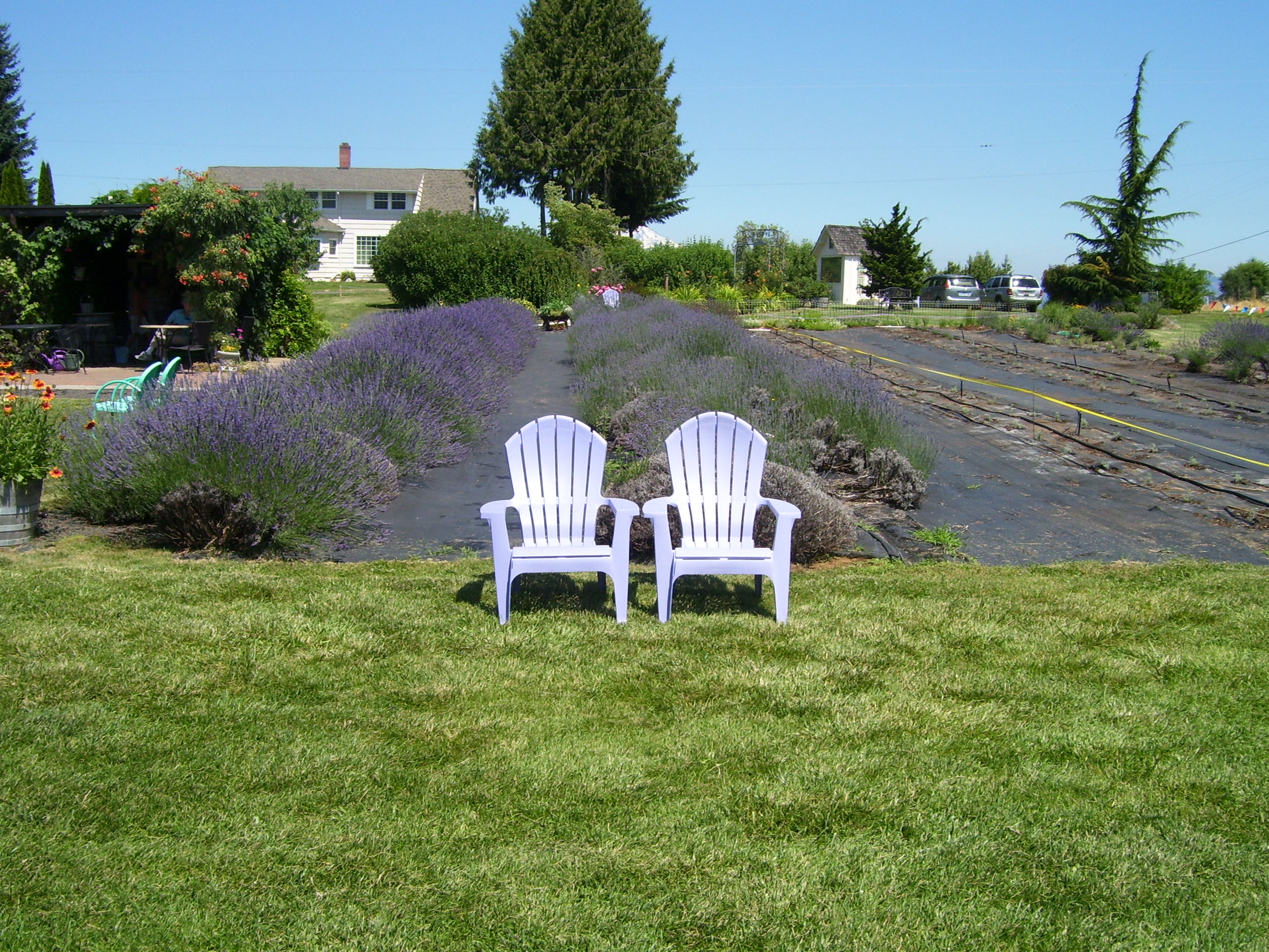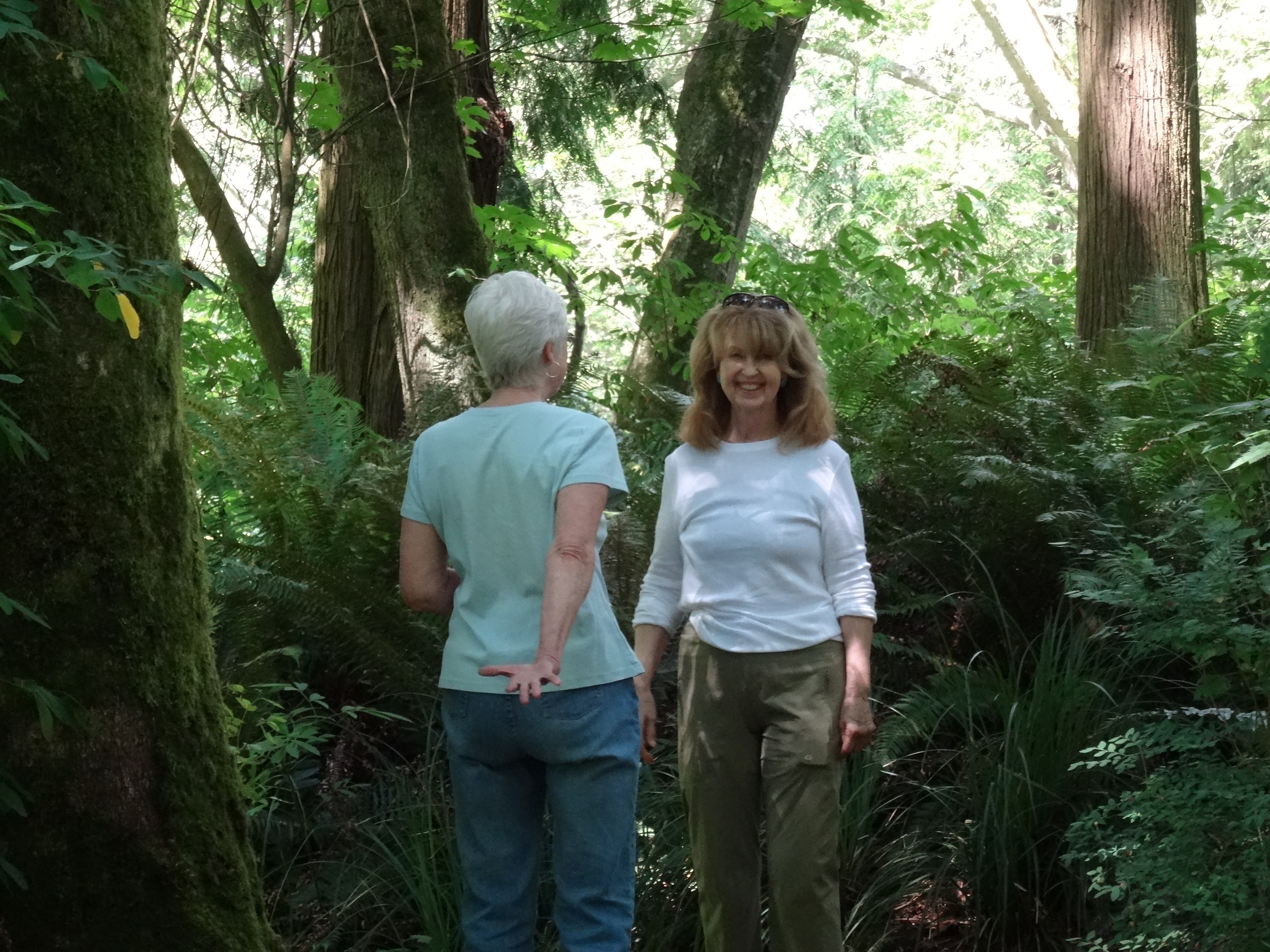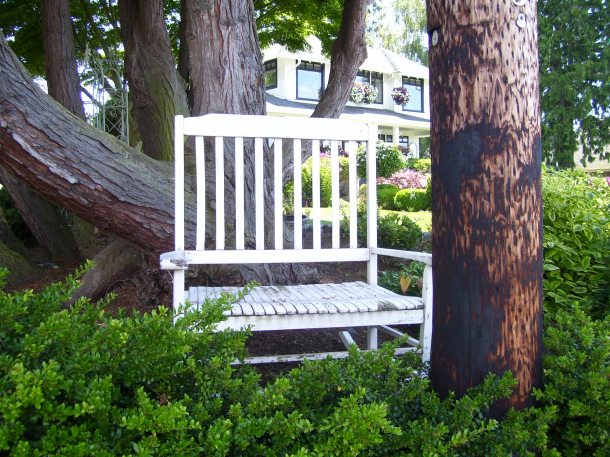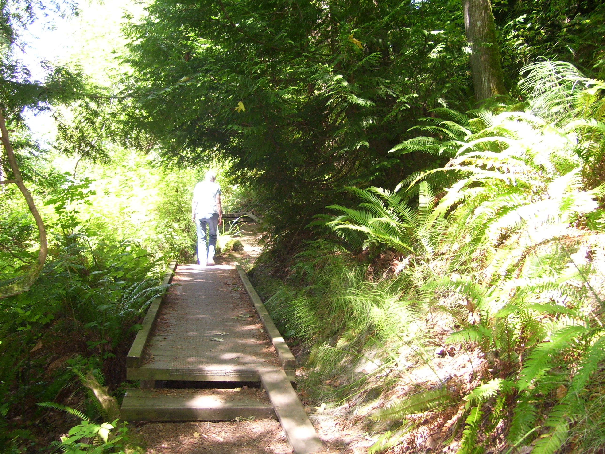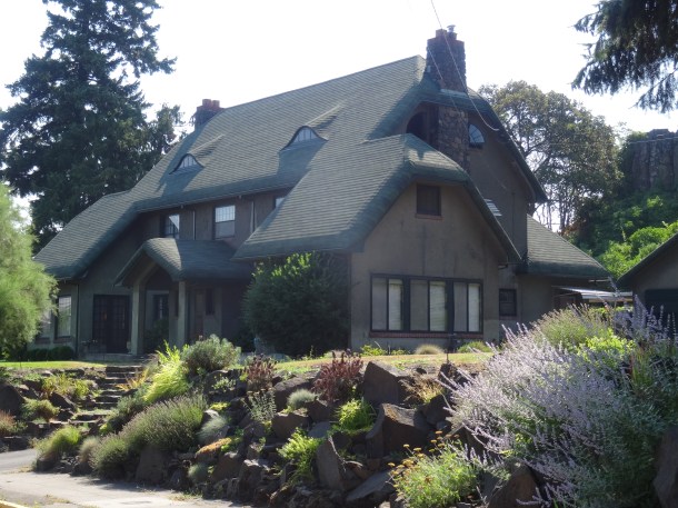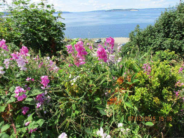 The little town of Mukilteo, located a short distance from Seattle, is absolutely charming. The landscape is hilly, the flowers bloom recklessly – roses, daisies, pansies, phlox, hollyhox, snapdragons, hydrangeas – and it overlooks the blue blue blue of Puget Sound. The wooded hills are sewn with redcedar, firs, hemlocks and undergrowth, with salmon streams running through the underbrush.. The architecture throughout is very varied, from small cottages on up to larger stately homes, with green and colorful landscapes.