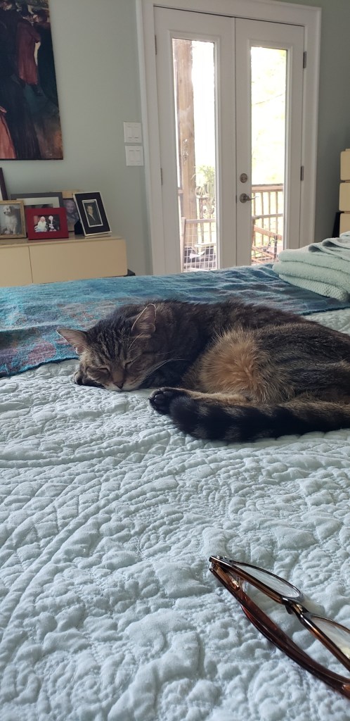 It is so quiet, all you hear are the music of the birds and the wind soughing through the trees. Charlie, Lesley’s cat asleep below, agrees!