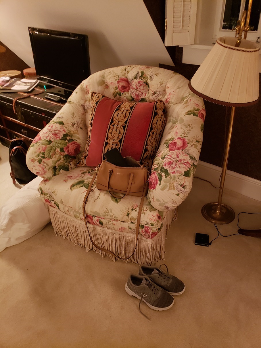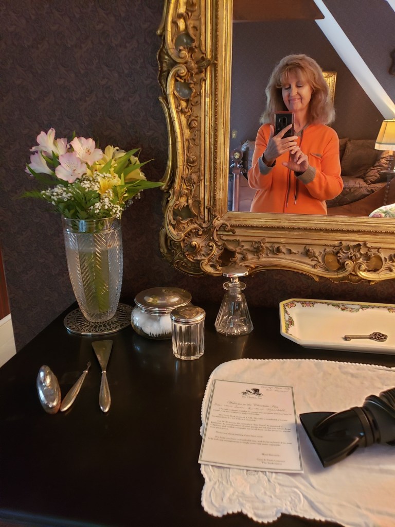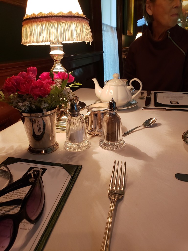 Up around 9AM, we breakfasted downstairs in the little restaurant, with Lenox china and Waterford glasses beautifully displayed on the white linen tablecloths. Our menu: fresh orange juice, hot coffee, bagels and spinach, feta and tomato omelets. A long stemmed fresh red rose was on every table.