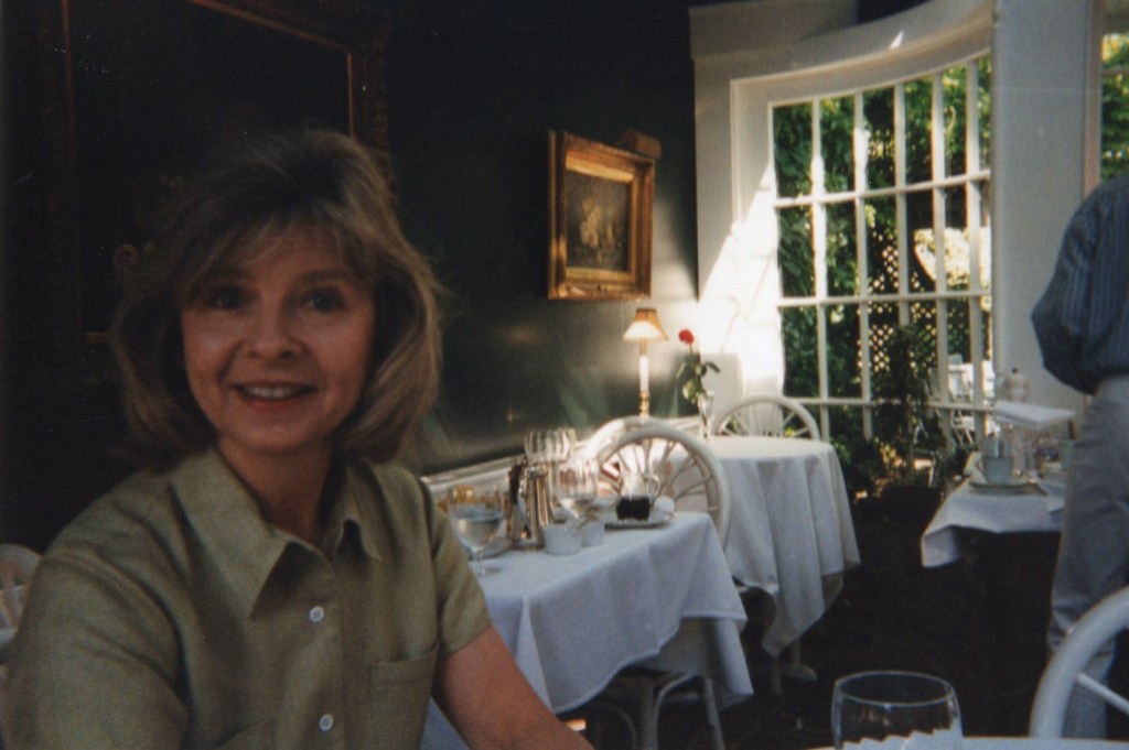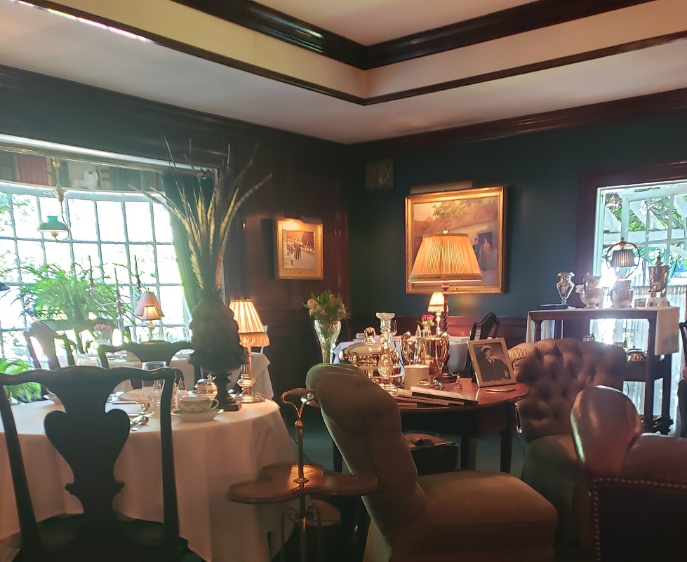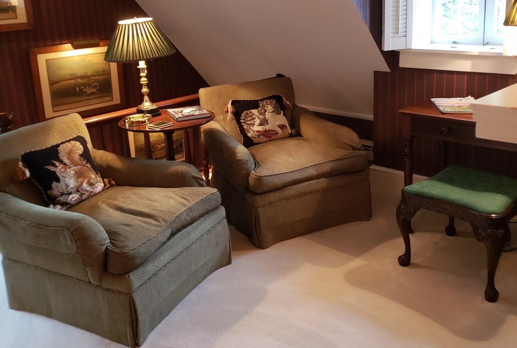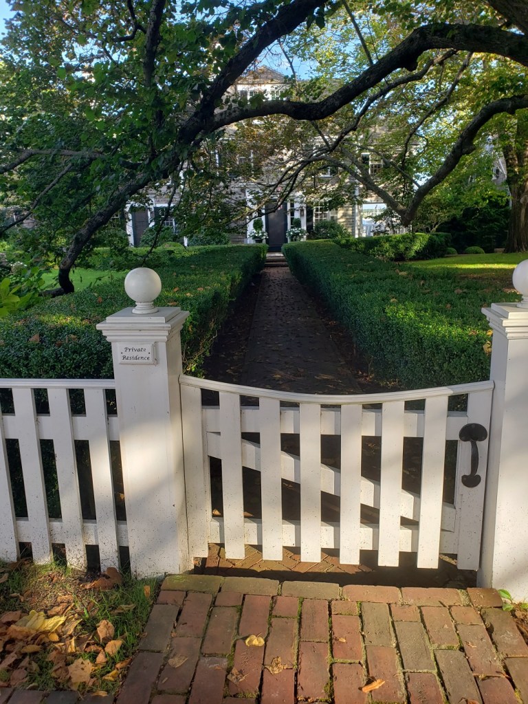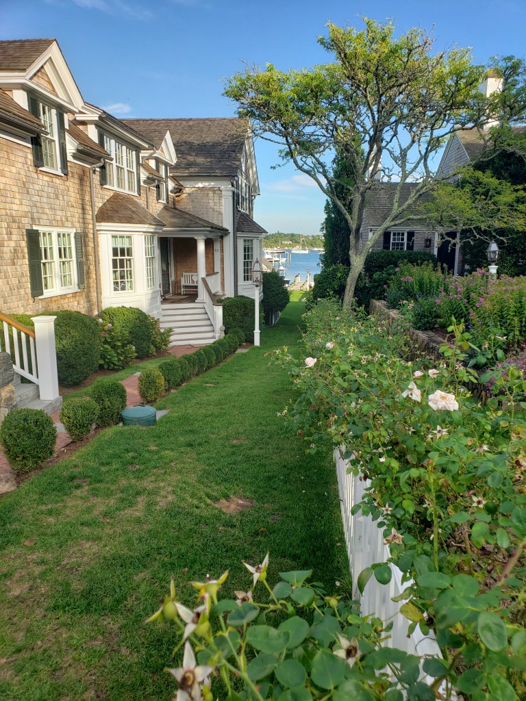 We arrived quite rapidly at the island’s tiny airport. The weather at Martha’s Vineyard was glorious: blue skies, brisk breeze, and a slight chill in the air. The taxi took us to the Charlotte Inn, everything it’s been cracked up to be and more (and one of my favorite places to stay in the entire world). Waterford crystal decanters filled with Bristol Cream Sherry are in every room, so we toasted to the next three days. The tiny hall downstairs led to a tiny front desk; the Inn was full of fresh flowers – in our room, which we reached up a winding staircase; in the tiny hallway upstairs and down; in each sitting room. Our room was delightful, papered in dark red stripes with a tiny green pattern. Two twin beds with big thick mattresses, clothed in white covers and duvets. Dark green and mulberry striped draperies hemmed at the ceiling with padded pelmets. Two deep green club chairs in the corners. Two latticed windows opened onto a little side street, the third onto a grass lawn, flowers and fountain. The bathroom was huge, and snowy white. The Inn is surrounded by black iron railings or white picket fences. It was absolutely enchanting.