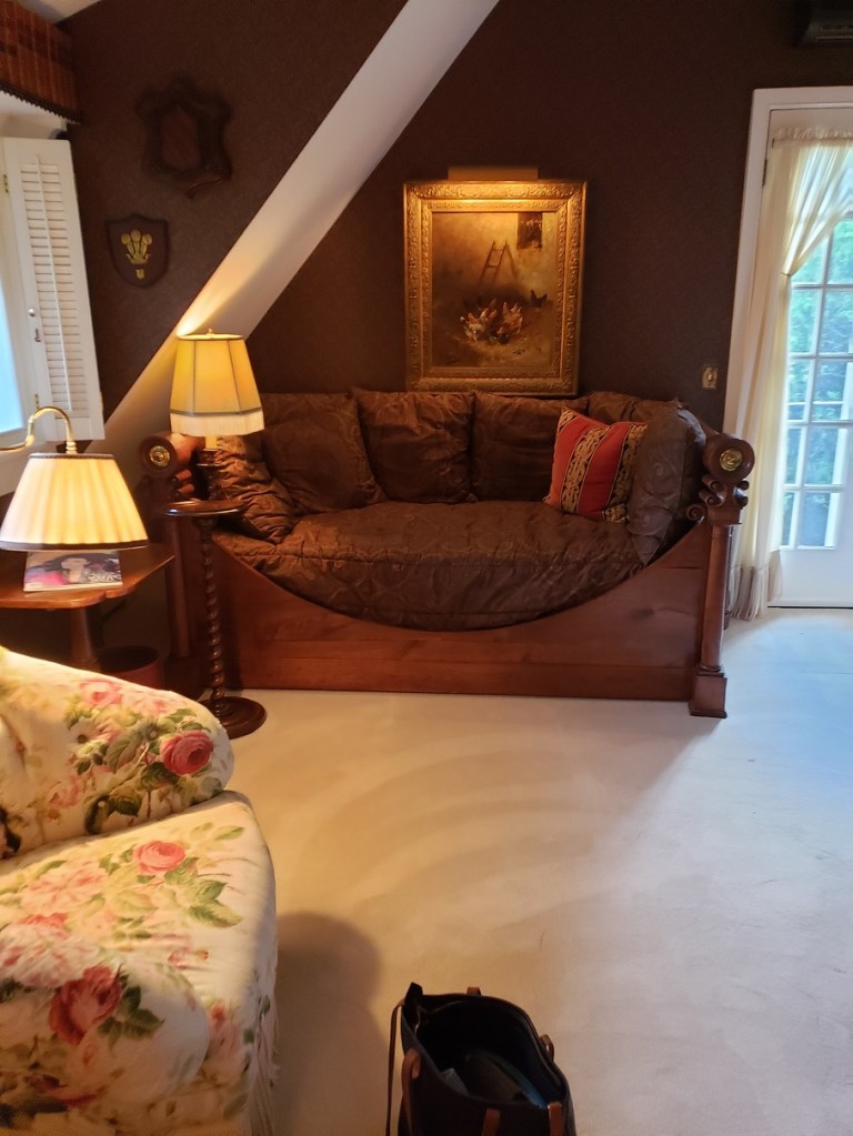 Once again on Martha’s Vineyard, we dropped off our bicycles and keys, and stopped for beer and nachos at a little restaurant hovering over the water. The sky was dark, and it began to rain. We ambled back to the Inn, looking forward to bubblebaths and rest. Fires burned in the fireplaces in the inn’s sitting rooms, which were filled with flowers and beautiful artwork. I heard the church clock down the road chiming the hour; the church bells chimed in unison. A magical world.