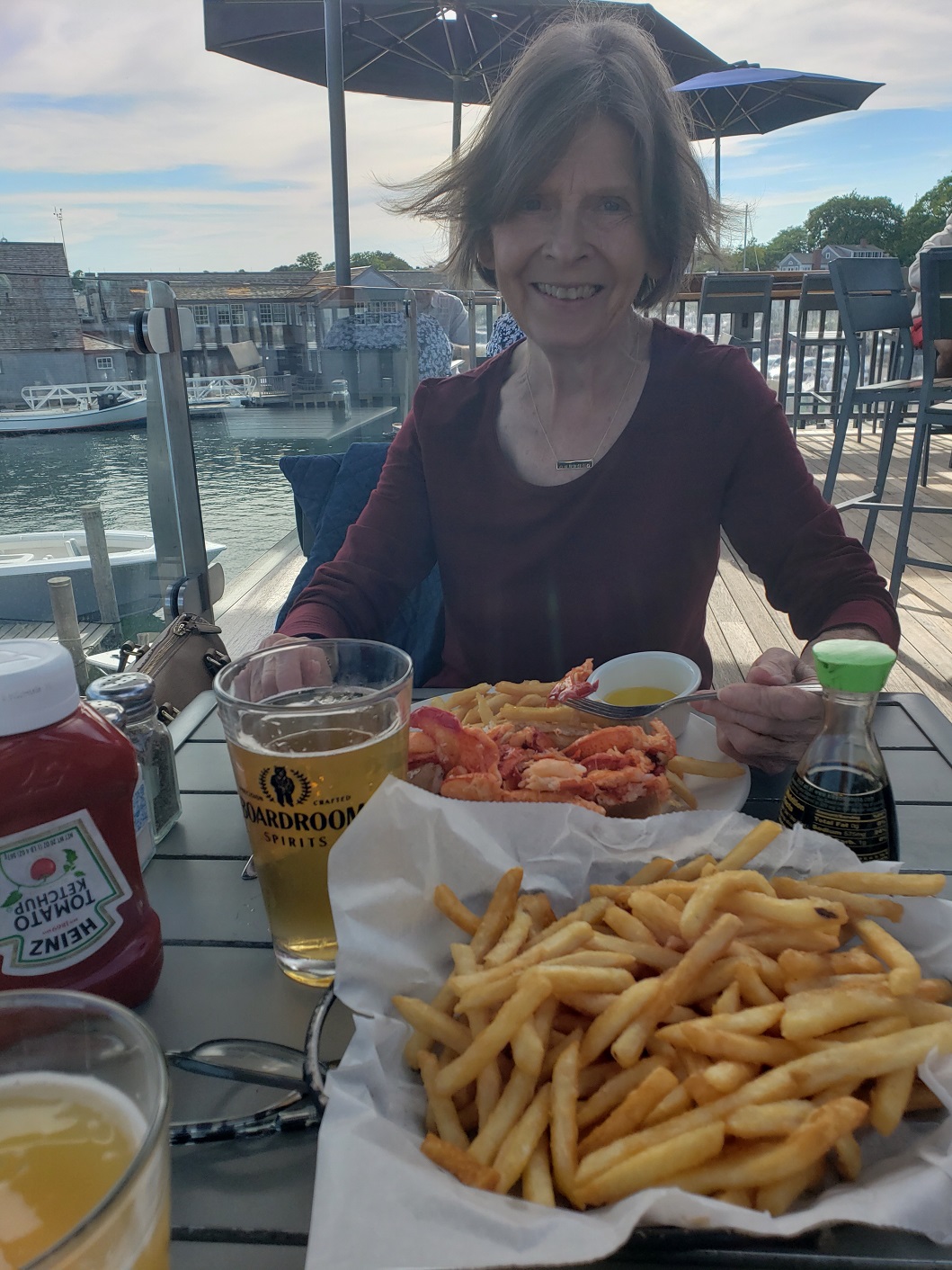 We dropped our suitcases then walked around the town and down the road to The Square Rigger, a tiny restaurant splot in the middle of the road fork. Menu: broiled lobster and salad and a (small) piece of pecan pie. After dinner, it was back to the Charlotte Inn under a clear dark sky dotted with stars, in the very fresh air, with a brisk breeze following our footsteps. Lene and I talked non-stop, until we both passed out from exhaustion!
