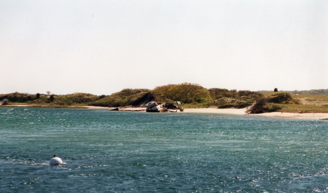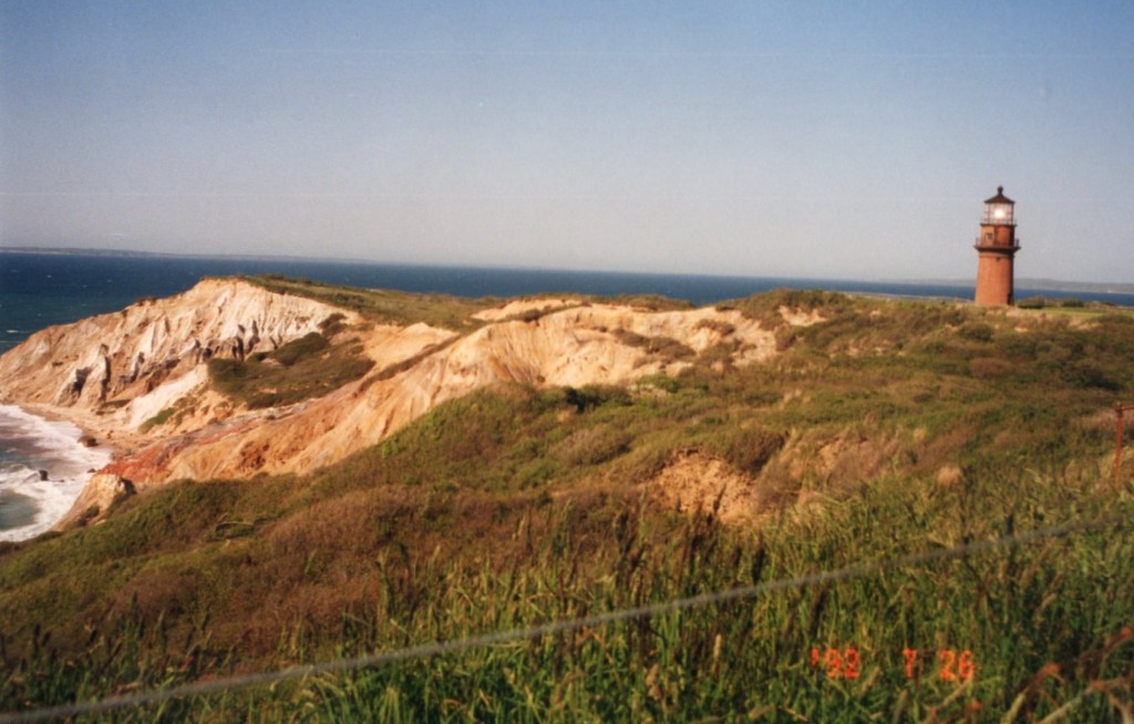 Next came Chilmark and Menemsha, two tiny fishing villages, with small gray clapboard houses. “Jaws” was filmed at Menemsha, and just across the inlet, the remains of the “Orca” could be seen on the tiny beach. From here, it was a winding road to Gay Head/Aquinnah, and the Cliffs which look out forever over a silvery-gray Atlantic. The day was still brilliantly sunny, but the wind was immensely strong, bracing and fabulous.