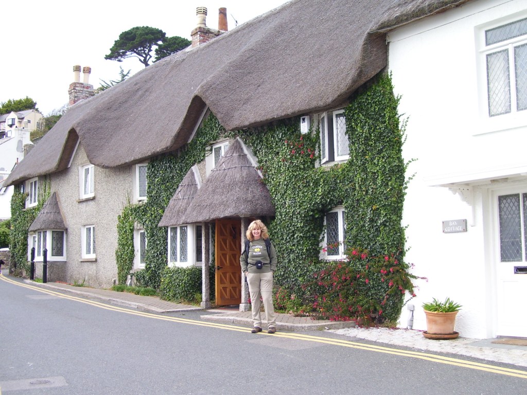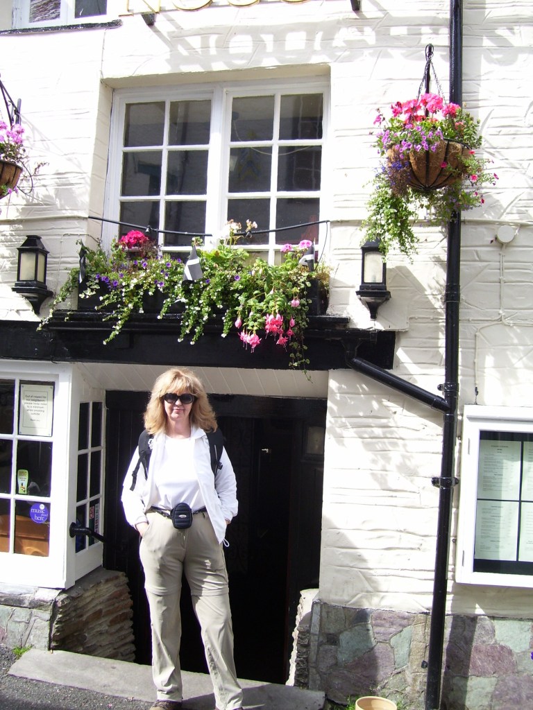 Got up for a wonderful English breakfast – eggs, bacon, sausage, fried tomato, fried bread, basket of these terrific baguettes, Cornish butter (may as well just apply it to my hips) – then Martin drove us to Looe to start our walk. The Coast Road out of Looe onto cliffs overlooked a silver sea. It was a beautiful day – intermittently cloudy and sunny, perfect for walking the six miles to Polperro. We reached Talland Bay (halfway to Polperro) and stopped for a break, then I ran up the hill to see if Allhays <an old B&B manor house that was my favorite of all time> was still there. It was – just as pretty as ever, and still called Allhays, but now a private home. I snapped a few photographs, then it was back down the hill to catch up with Elisa and Leslie on the coastal footpath to Polperro. The views from this path are breathtaking: long green cliffs soaring to a crystal blue sky, and water the color of pearls.