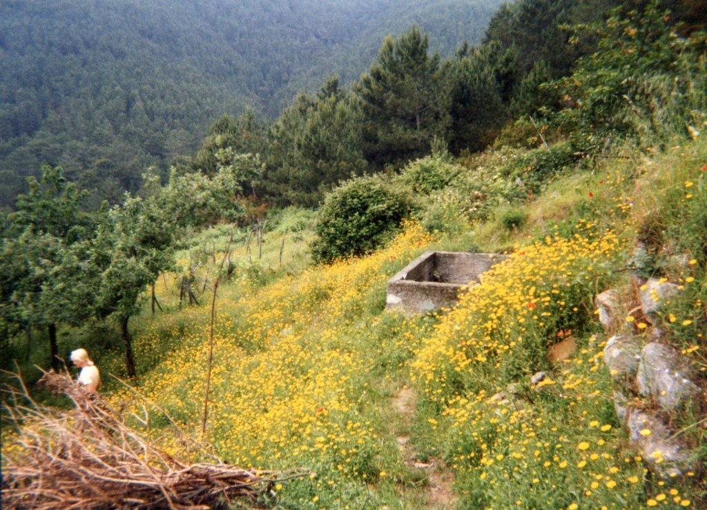 The hike from Santa Margherita is through some of the most enchanting landscapes in the world. Endless sloping fields of fern stretch to meet woods of chestnut, pine, and wild cherry trees, and all sorts of flowers perfume the air and line our trail – this is our pathway. General impressions are of blazing color: bright yellow gorse everywhere and villas dotting the terraced hillsides in all warm beautiful Italian tints. We have a slight shock when I inadvertently step on the tail end of a snake – much screaming and dashing about ensued (and that was just the snake!)