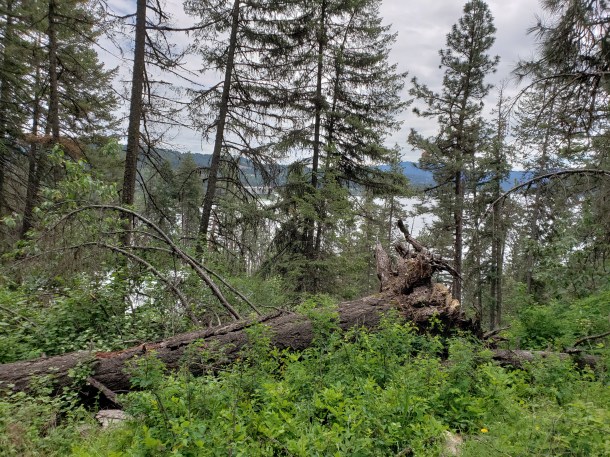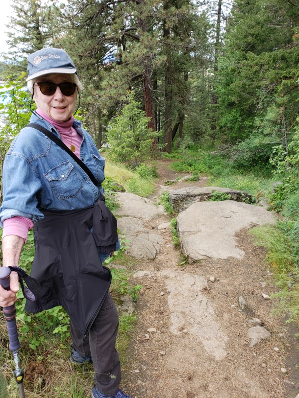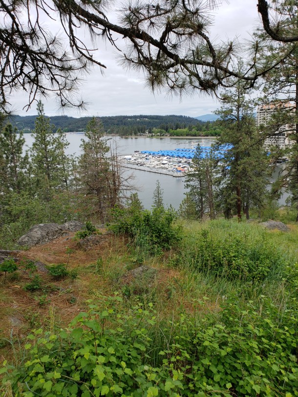 The trail, while not terrifically difficult, was nonetheless uphill and rocky…it circled Lake Coeur d’Alene, giving us misty views of far-off mountains, fir and pine forests, and beautiful blue clear water. The trail itself for the most part was paved in pine needles, so soft underfoot. My hiking boots were holding up really well…and I also had my twin poles for balance, so I was good to go. Lee kept to a single pole, and beavered up the mountain toot sweet!
