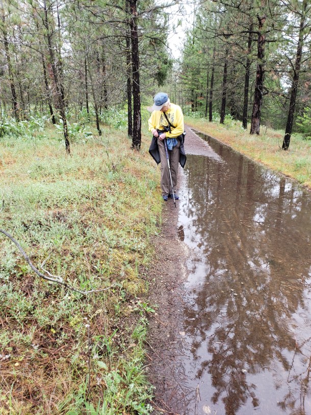 We got there while all was still relatively dry, and then took a few minutes trying to get my “other” pole to work – which – ta da! – I finally did. Off we went through the puddles, like ducks.
