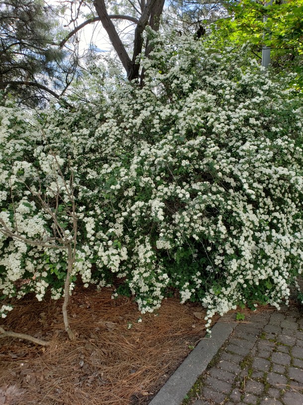 The landscape was green green green – dotted with white and purple lilacs, purple iris, white spirea, rhododendrons, and other gorgeous flowers in full blossom. The sky was very blue, the clouds very white.