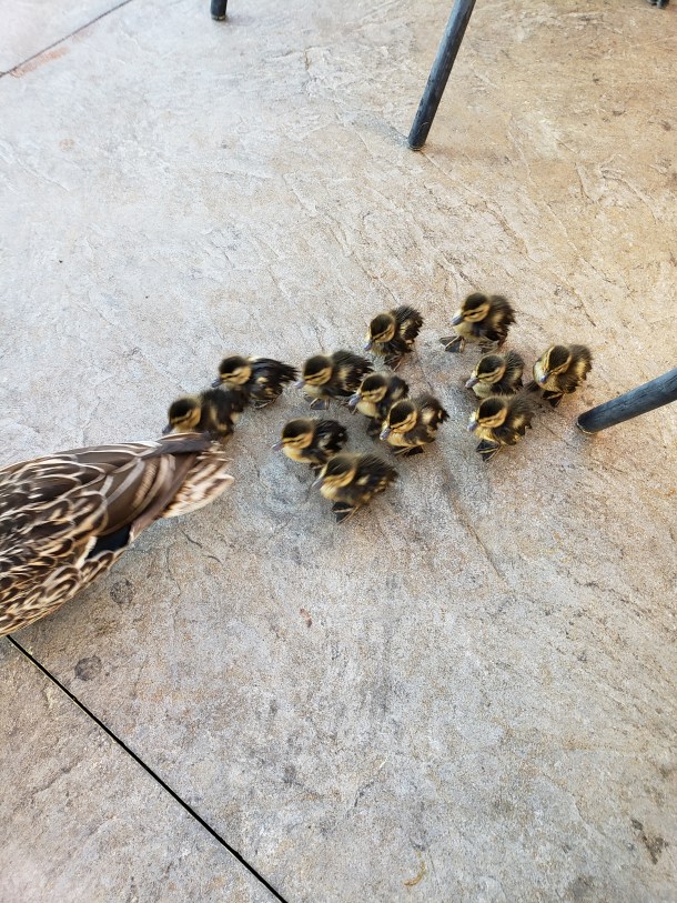 We sat on the patio in the late afternoon sunshine, sipping and just kicking back…this time a little group of ducklings and their mom joined the merry throng on the patio…they pattered around, duck-nibbling this and that, and finally found their way to grass and river. Perfect!