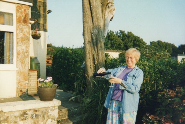 The house itself had stone flagged floors. Our bedroom had twin beds covered with rose flowered chintz covers and frilled pillowcases. The room – as are all the rooms -was whitewashed, with dark oak Tudor beams, and a very low ceiling. The bathroom also had oak beams, on which I had already knocked my head, and a step-down, which had sent Lee crashing into the tub. (Crackington Haven – well named!) The room had two low, low, low diamond-paned dormer windows with inset window seats. Another smaller window faced the beds.