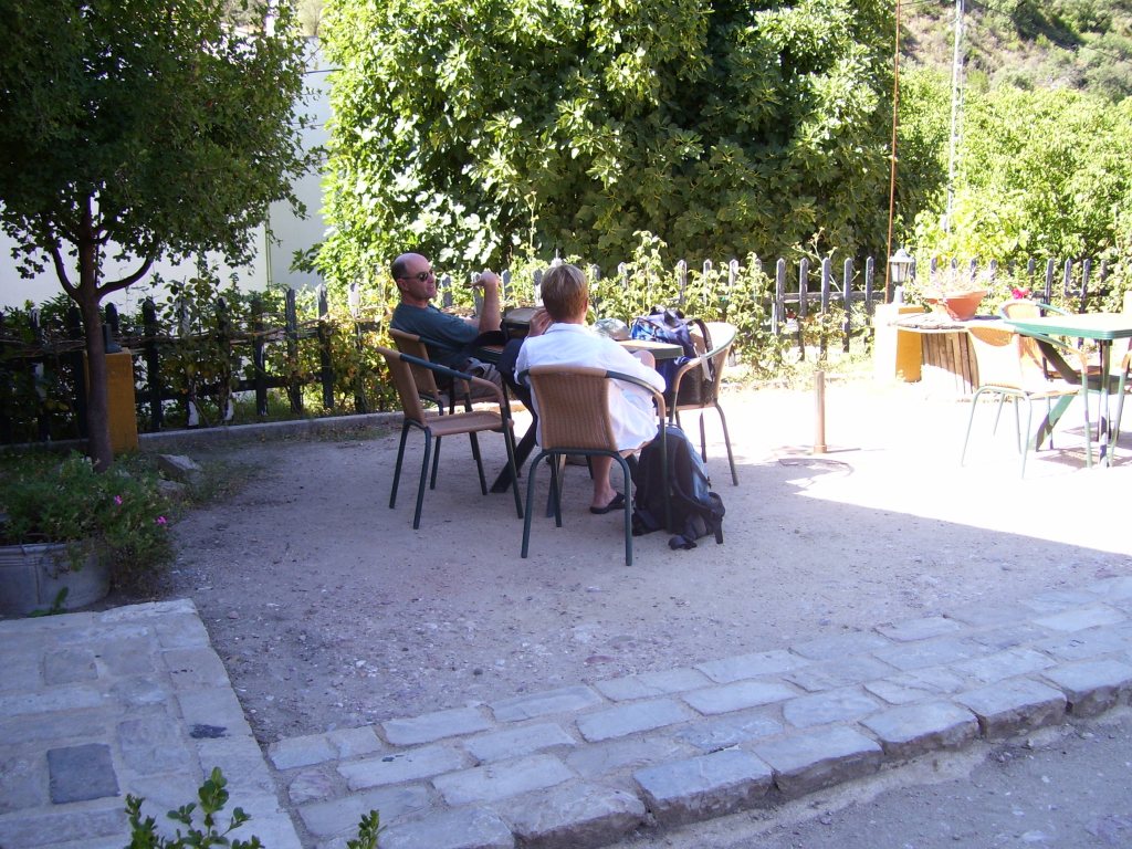 We continue clambering down over boulders and the rocky trail and finally at about 3:30 came to our little taverna, where we sat in the shade drinking cokes and yakking up a storm. Back in the van for a drive back to our hotel through incredible mountain scenery.